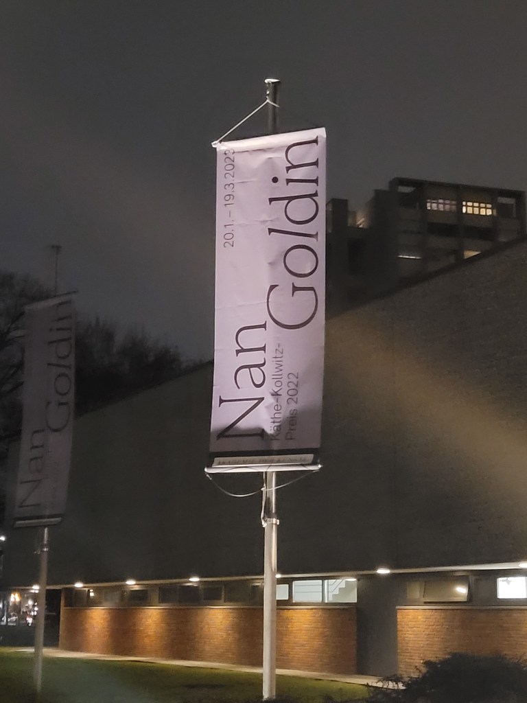 In der Akademie der Künste im Berliner Hanseatenweg wird eine Ausstellung der Fotografin mit exemplarischen Bildern aus allen Schaffensperioden gezeigt. Nan Goldin ist aktuell hoch populär und wird vielfach geehrt. In der MONOPOL wurde sie zur einflussreichsten Künstlerin 2022 unter den HOT 100 gekürt, ähnlich in der ArtReview in London auf Platz 8 und in Berlin wird sie mit dem Käthe Kollwitz-Preis geehrt.