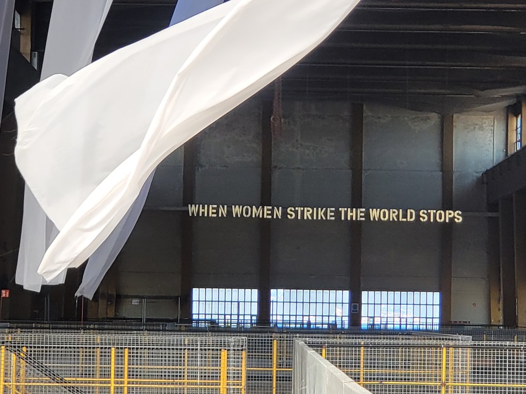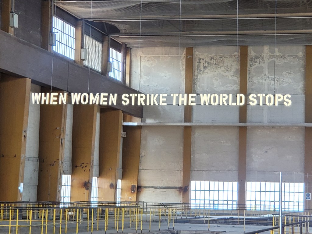 Eine weitere künstlerische Position in dem Kraftwerk sind die großen Leuchtbuchstaben an der Stirnseite der Halle. Sie stammen von Claire Fontaine, der Künstlergruppe, die bereits den Slogan der Venedig-Biennale multipel gestaltete („Foreigners everywhere“). In Barcelona heißt es: „WHEN WOMEN STRIKE THE WORLD STOPS“ in Anspielung auf die lokale Historie.