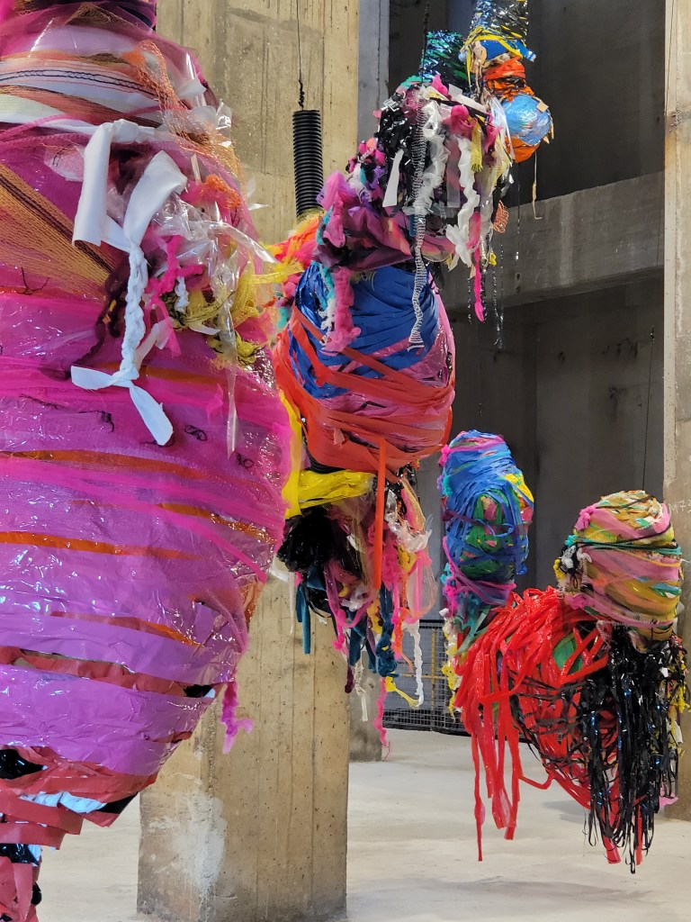 Fröhliche bunte von der Decke hängende Figuren von Nnena Kalu sollen vor allem zu meditativer Introspektion anregen. Sie erinnern ein wenig an die Nanas von Niki de Saint Phalle und geben dem brutalistischen Betonbau einen herrlichen Kontrast.