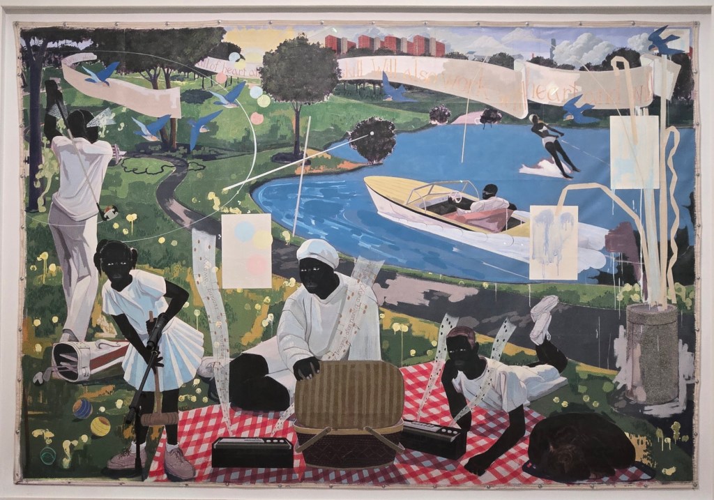 Der Künstler malt fröhliche Alltagsszenarien: im Beauty-Salon, am See oder im Nachtclub, inszeniert jedoch die Diskriminierung der Afroamerikaner*Innen in den USA hochgradig sozialkritisch. Picknick, Golf, Krocket, Wasserski: sind das nicht die Hobbies reicher weißer Familien, die hier von Schwarzen selbstverständlich gelebt werden?
