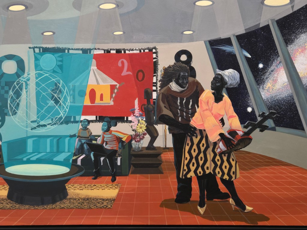 Kerry James Marshall wurde 1955 in den US-amerikanischen Südstaaten in Alabama geboren, zog später mit seiner Familie nach Los Angeles, wo er Art-and-Design studieren konnte. Später fand er – bis heute –  seine Heimat in Chicago. Da drängt sich sofort die wichtige Frage nach einer Teilnahme auch an der kommenden Documenta 16 auf. Bekanntermaßen bekräftigte deren Kuratorin Naomi Beckwith, dass sie sich ihrer Wurzeln in der Black-Community in Chicago sehr bewußt sei, was sich auch in der Konzeption der Documenta wiederfinden werde. Marshall dementiert jedoch INArtberlin gegenüber sofort: „Nein, ich werde auf keinen Fall erneut bei der Documenta ausstellen. Ich war dort schon zweimal (1997 und 2007). Das reicht völlig.“ Dies wiederholt der sympatische 70jährige jedoch mehrfach so vehement , dass man fast das Gegenteil glauben könnte.