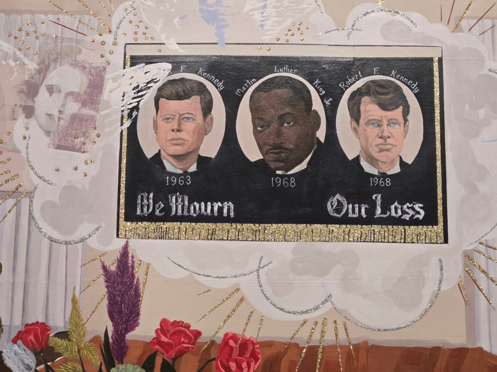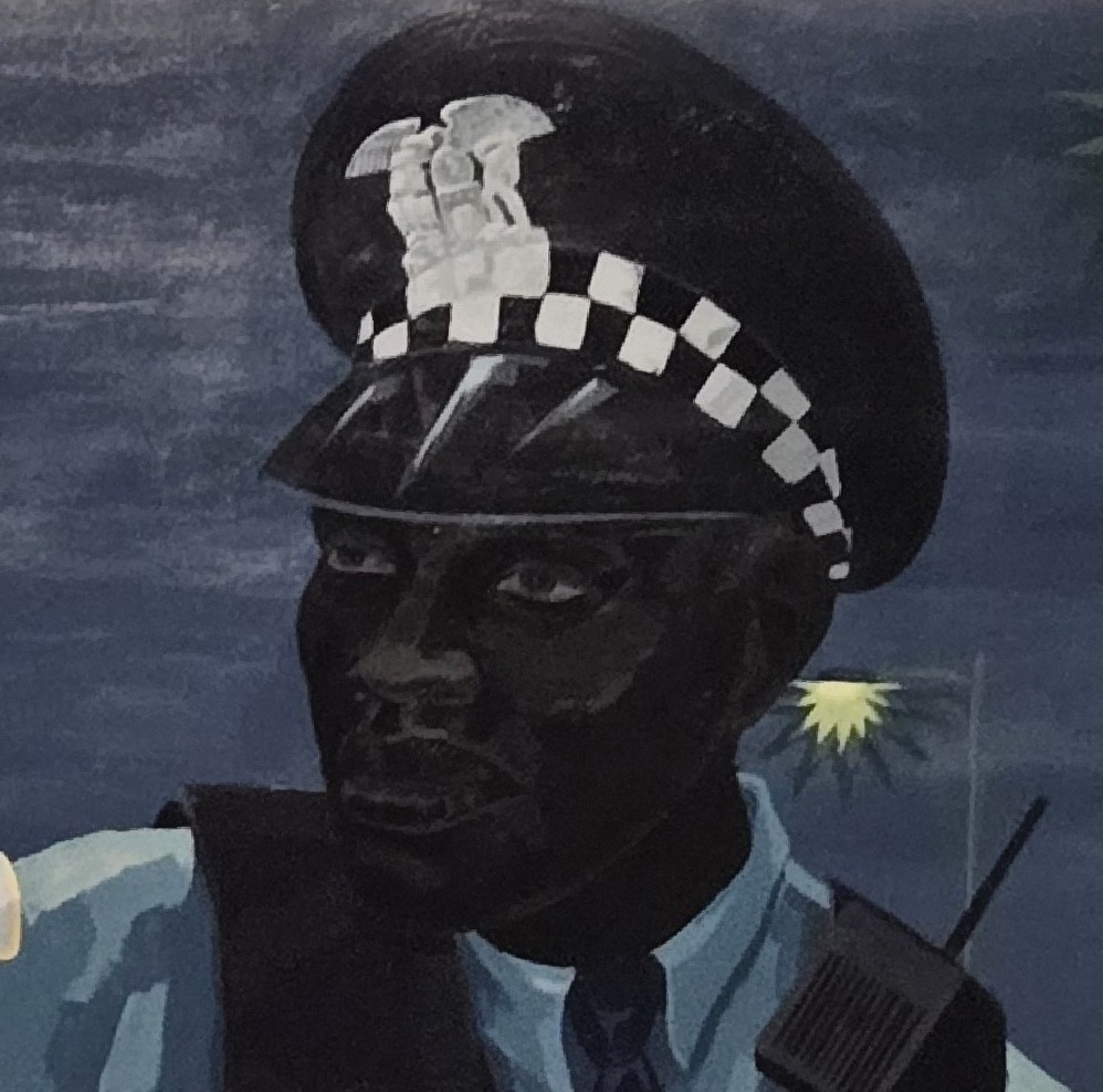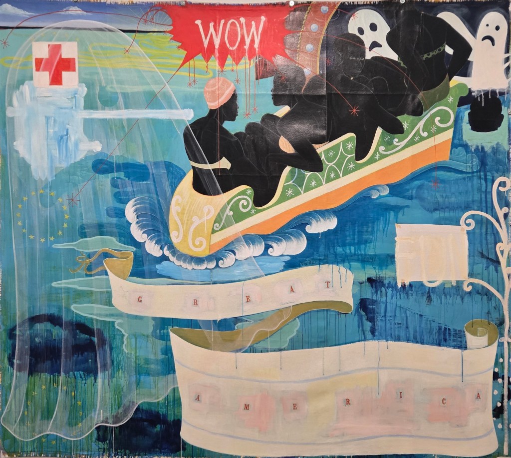 Die monumentalen Gemälde sind aber auch Wimmelbilder. Überall sind kleine Details zu entdeckten, z.B. auch Collagen mit Zeitungsausschitten oder ironischen Spruchbändern. Ebenso finden sich Portraits berühmter Persönlichkeiten des antirassistischen Widerstands in den Bildern. Es macht große Freude mit den Augen auf Entdeckungsreise zu gehen.