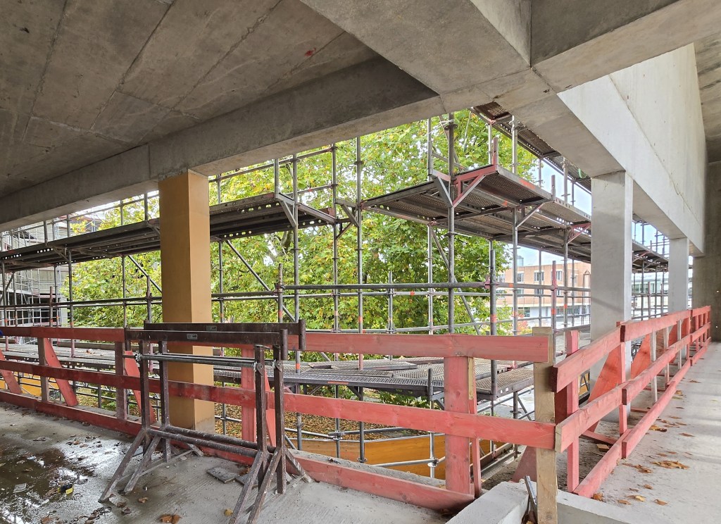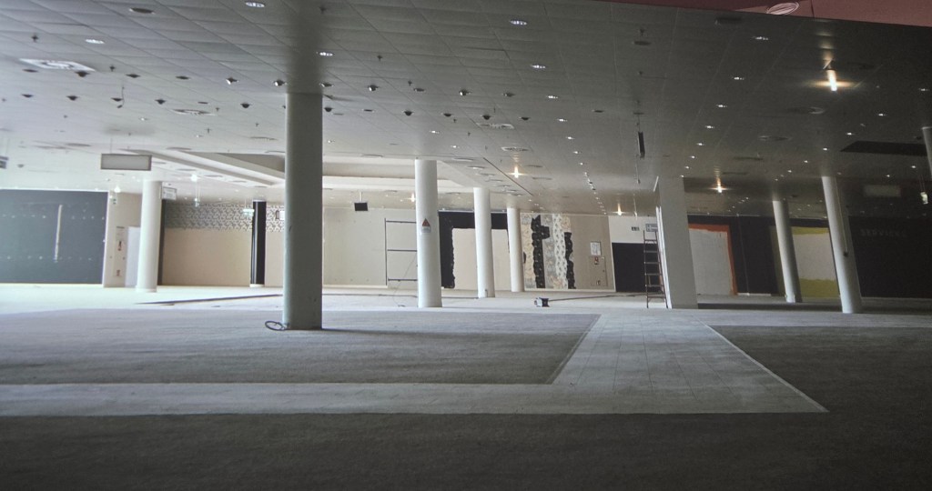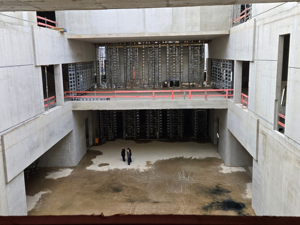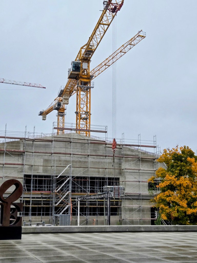 Doch was zeichnet den Neubau besonders aus? Er ist groß, extrem groß und er wird das Zentrum des sogennanten Kulturforums, wo er sich schon jetzt in voller Riesenhaftigkeit breit macht. Der Bau ist auch extrem schnell gewachsen: die Grundsteinlegung war erst im Februar 2024 und die Kosten sind bisher nicht explodiert. Ist er auch schön? Ja! Schon der Rohbau mit seinen vielen Stützen und den rauhen ungeglätteten Betonwänden und -böden und den freien Durchblicken zu den umgebenden Gebäuden übt in seinem brutalistischen Zustand eine ungeheuere Spannung aus, die danach ruft, mit Kunst bespielt zu werden.