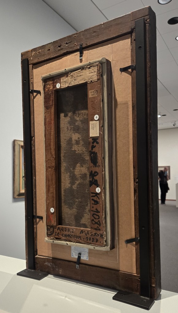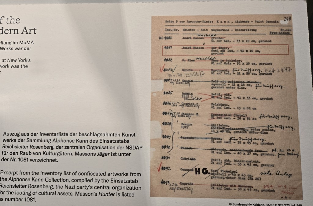 Ein besonderes Beispiel für eine bewegte Reise über Kontinente hinweg ist „Der Jäger“ von André Masson. Hierzu gibt es sogar ein Schriftstück, dass seinen Aufenthalt in einem Depot der Nazis beweist. Da die politische Führung surrealistische Bilder als „entartet“ einstufte, wurden viele von ihnen vernichtet. Dies wird auch über den Jäger vermerkt. Warum es nicht stattfand, bleibt ein Rätsel, jedoch wurde er nachweislich nach dem 2. Welt-Krieg dem Besitzer direkt zurückgegeben.