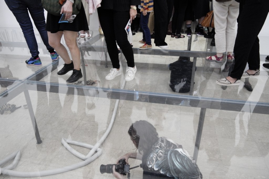 Ein Security-Mann steht mit Knopf im Ohr wie ein Wächter vor einer matten Plexiglastür. Der Kurator sagt zur Besucherin mit einem Lächeln: „Gehen Sie ruhig mal rein!“ Von innen hört man Klaviermusik. Die erste Tür öffnet sich in einen kleinen Flur. Man öffnet die zweite Tür. Drinnen steht ein Flügel, an dem zwei Pianistinnen vierhändig spielen. Doch sobald sich die Tür öffnet, stoppt das Spiel. Die Damen schauen den Besucher mit leerem Blick nur an. O.K. man schließt die Tür für den Rückzug. Prompt wird das Klavierspiel fortgesetzt.