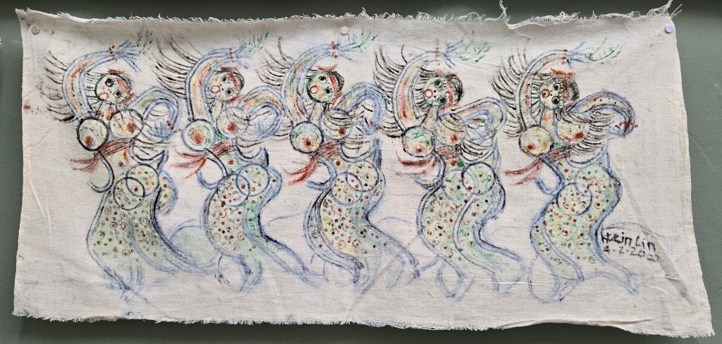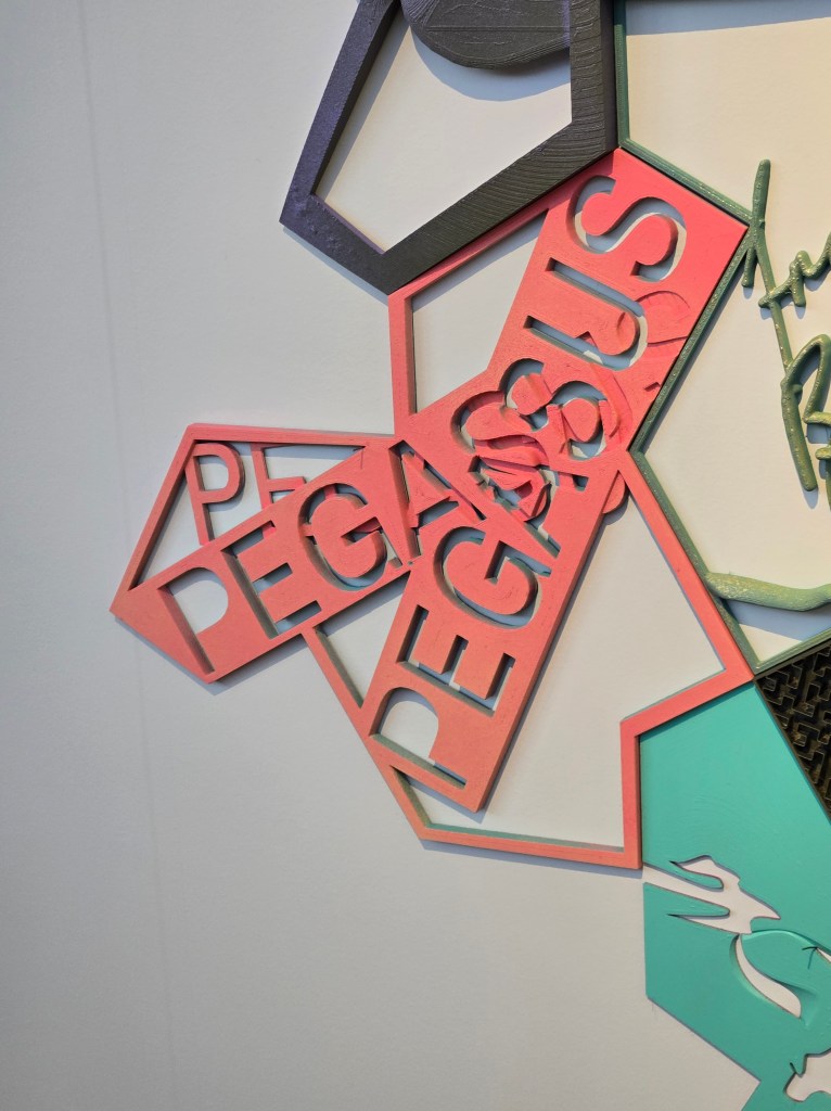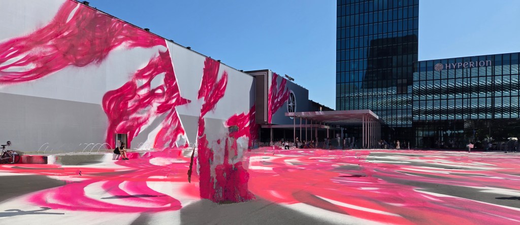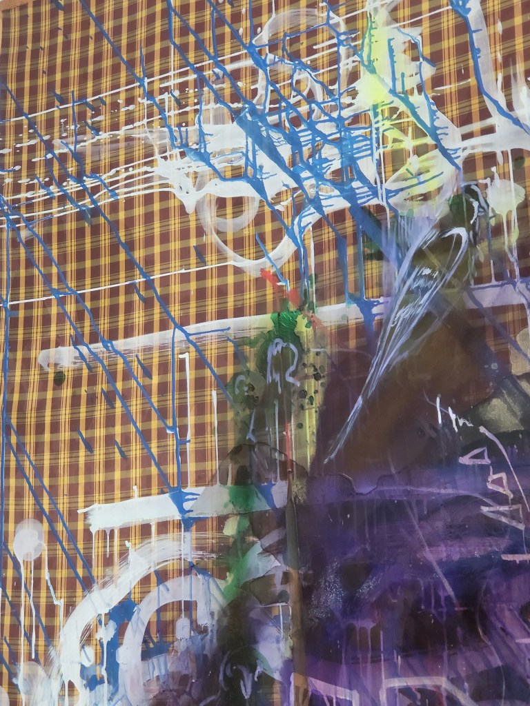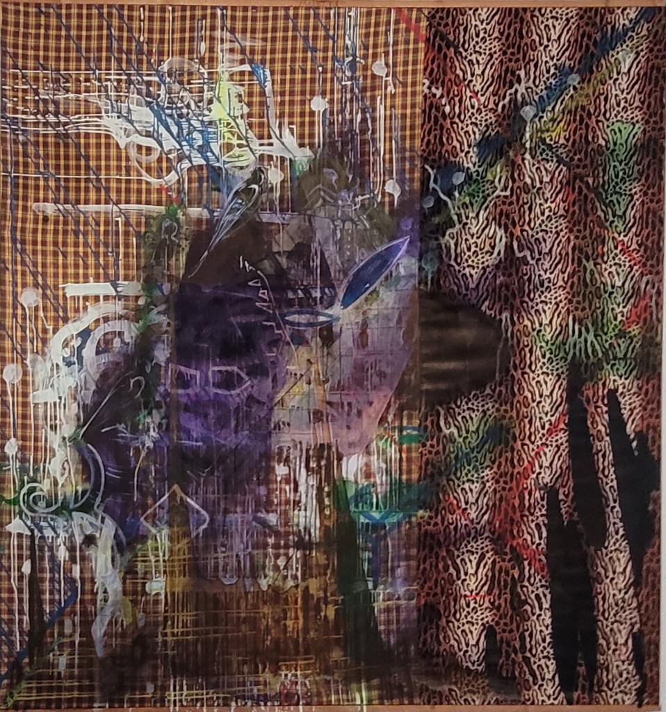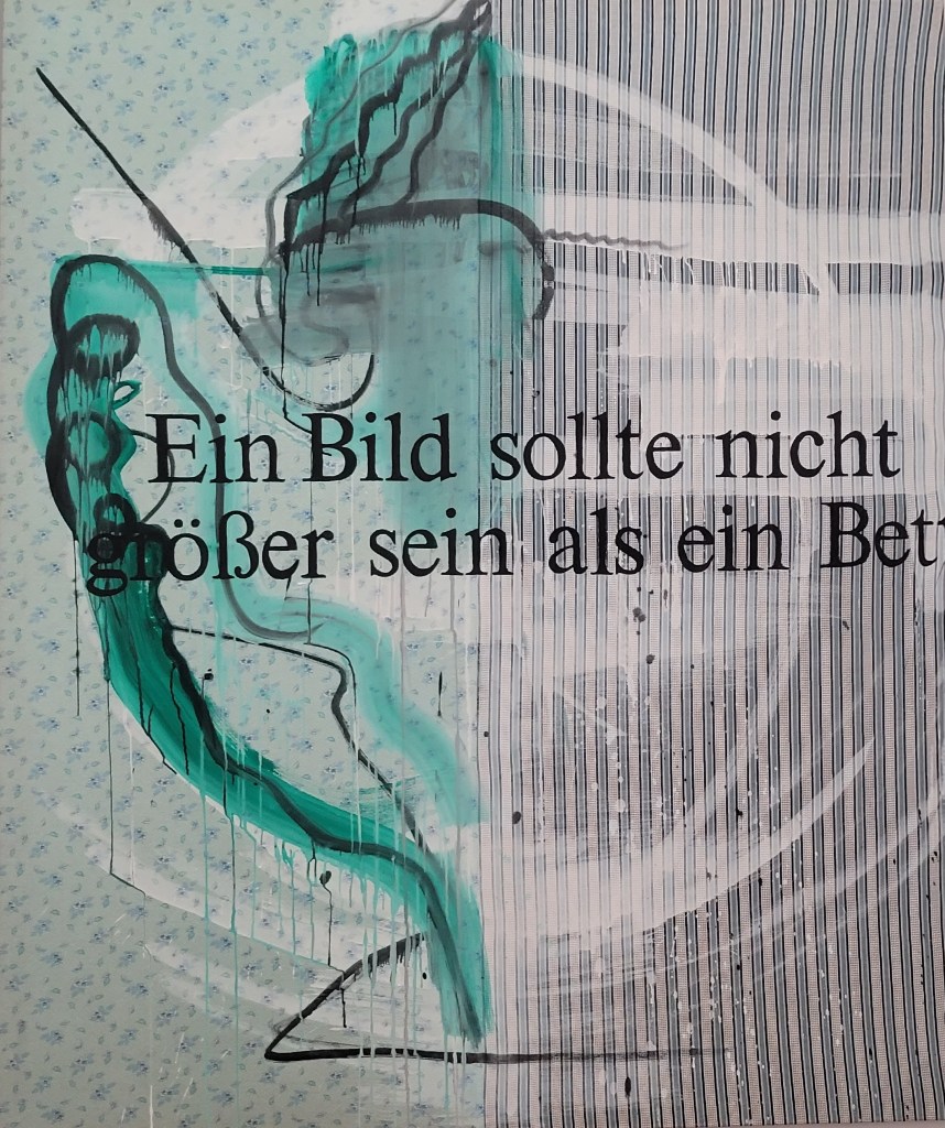 Wie eine Halfpipe gewölbt liegt das Gemälde von Hyunsun Jeon auf dem Hallenboden und zeigt ihre persönliche Ausdrucksweise, Natur und Abstraktion kombiniert darzustellen, die etwas an frühe Videospiele erinnert. Die Künstlerin wurde 1989 in Seoul geboren. Sie lebt und arbeitet auch weiterhin in ihrer Heimat.