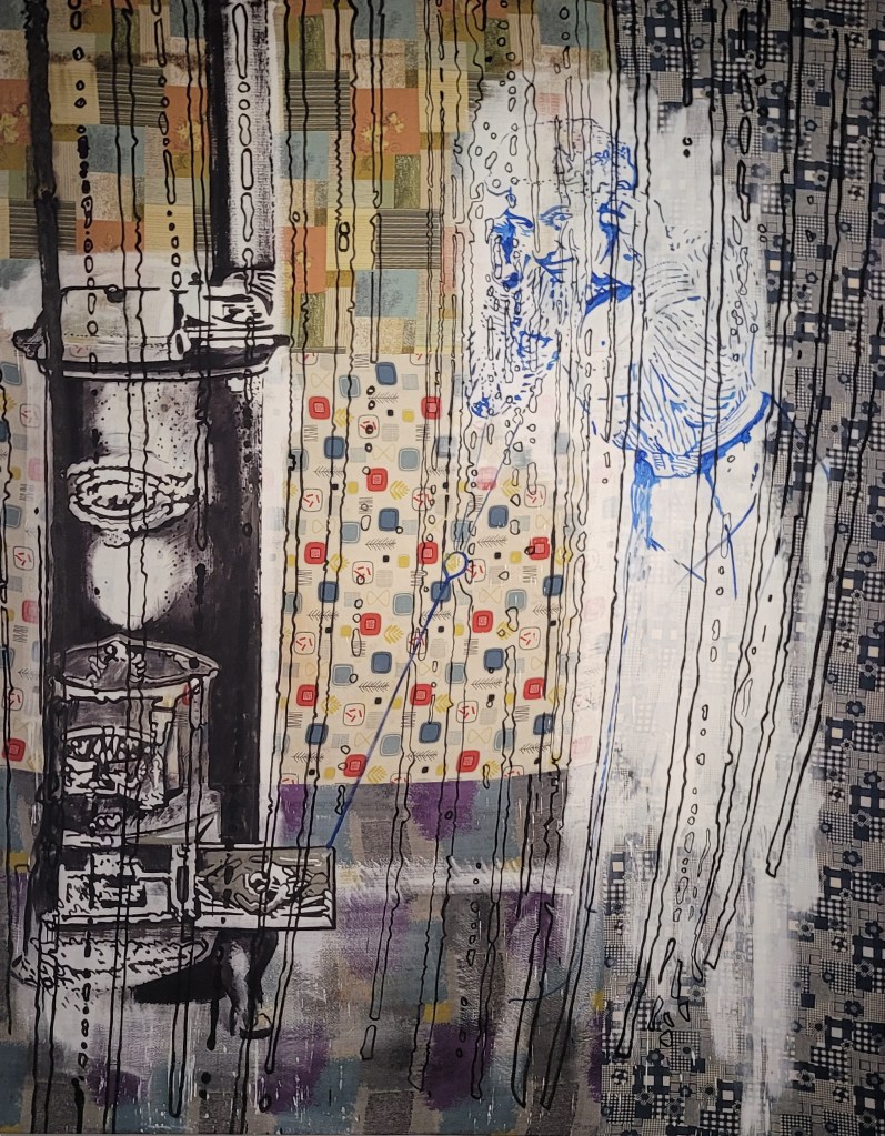 Wunderschön ist auch ein monumentales Bild von Antonis Donef, geboren 1978 in Sofia, der jetzt in Athen lebt und arbeitet. Es ist eine Collage aus archivarischen Buchseiten aus Encyclopädien und Landkarten, die er kalligrafisch und farblich überschrieben hat.