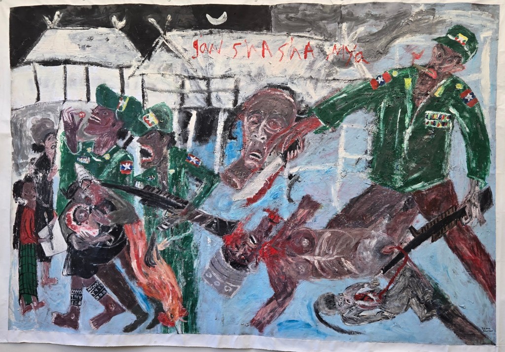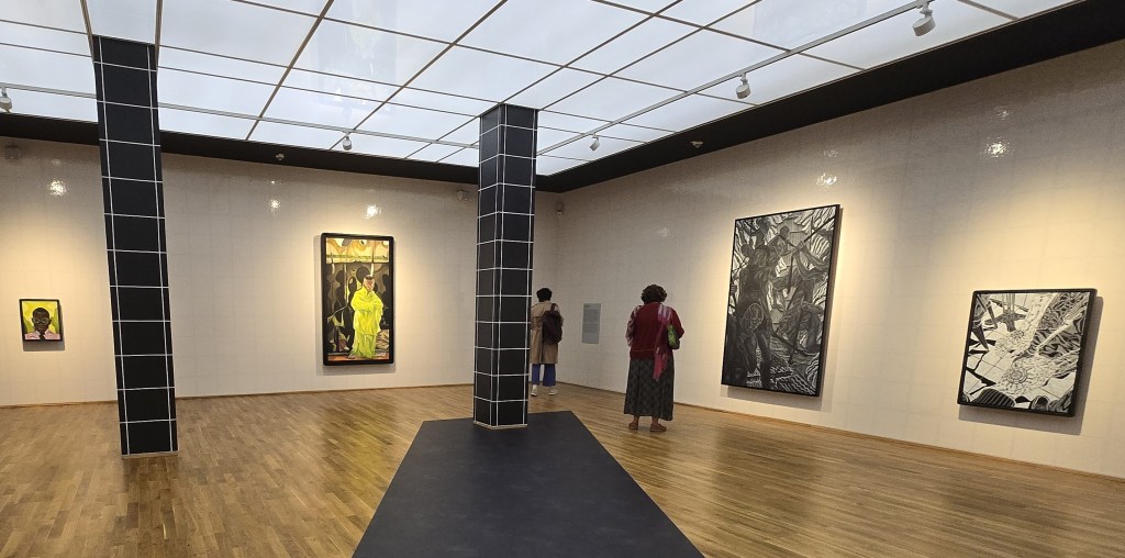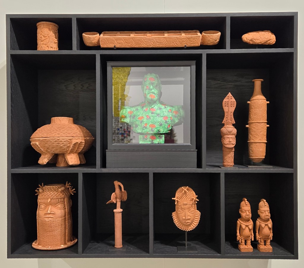 Didier Williams schuf einen Raum aus Skulpturen und Gemälden, die an Kolonialismus, Sklaverei und Flucht erinnern sollen. Doch das Ensemble wirkt nicht primär bedrückend, sondern fantastisch in seiner Farbigkeit und ungewöhnlichen Ausdrucksweise. So sind die Oberflächen der Figuren mit schwarzen und weißen Augen bedeckt und die Bäume abstrahiert dargestellt. Williams wurde 1983 in Port au Prince auf Haiti geboren, floh jedoch schon mit 6 Jahren mit seinen Eltern nach Miami. Inzwischen lebt er in Philadelphia, doch seine Herkunft prägt weiterhin seine Kunst.
