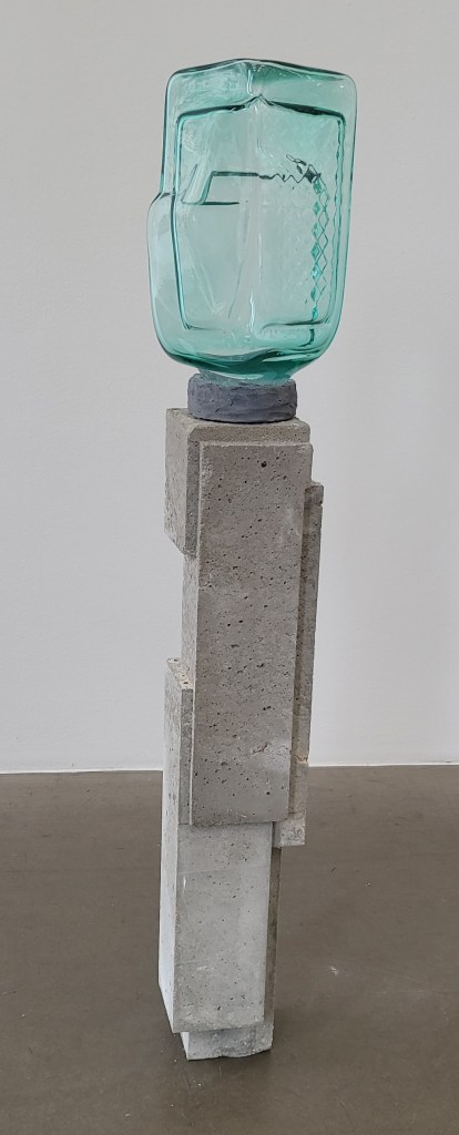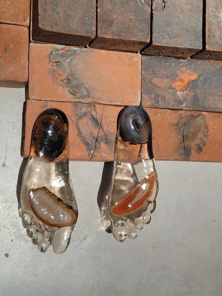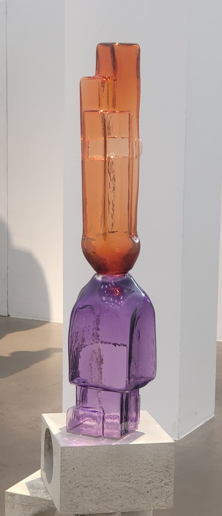 Fröhliche bunte von der Decke hängende Figuren von Nnena Kalu sollen vor allem zu meditativer Introspektion anregen. Sie erinnern ein wenig an die Nanas von Niki de Saint Phalle und geben dem brutalistischen Betonbau einen herrlichen Kontrast.