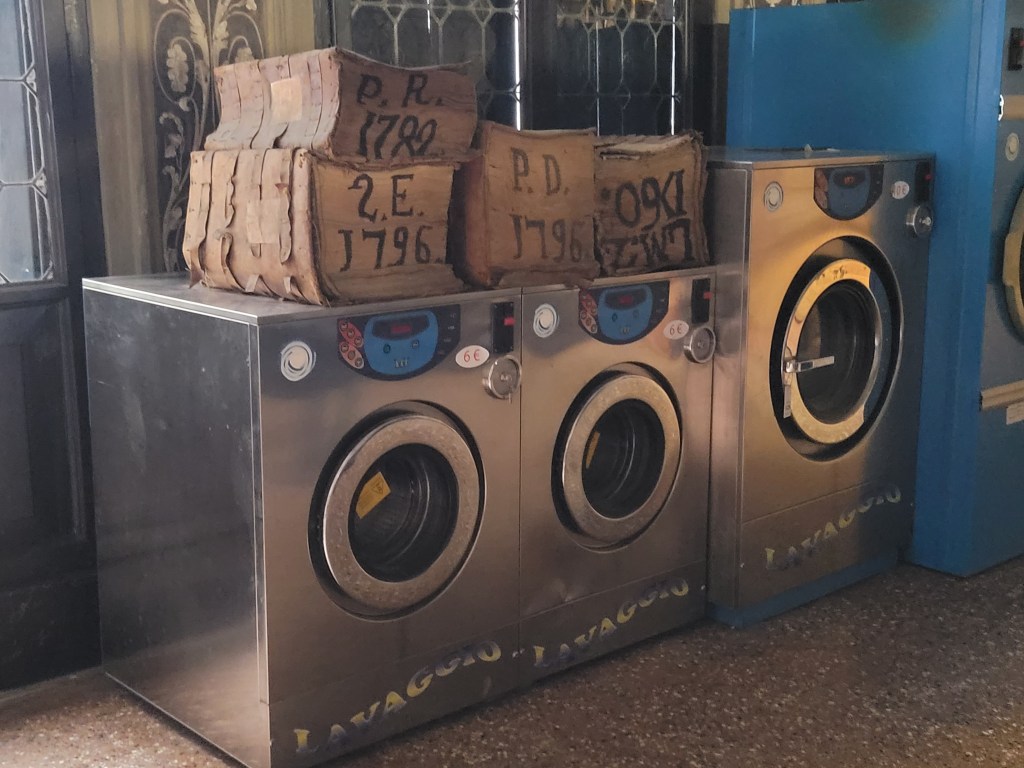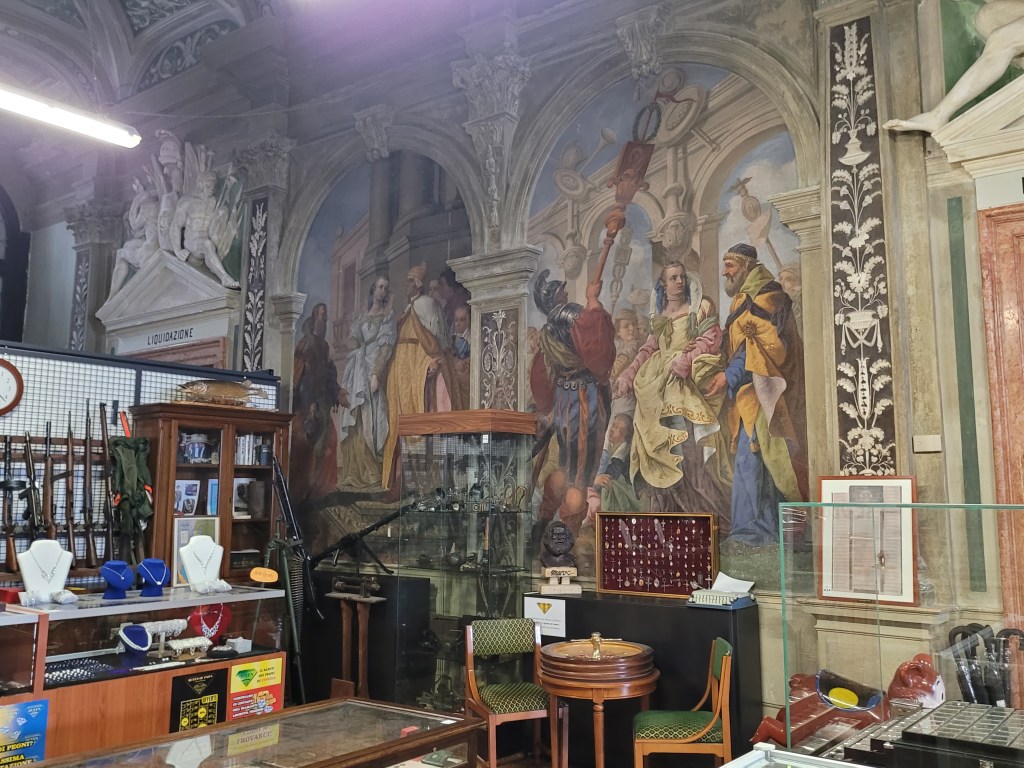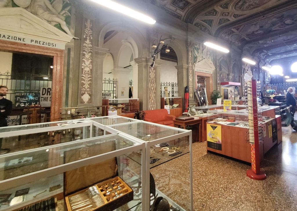 Eins der großartigsten Kollateral-Events anlässlich der Biennale Venedig ist die Verwandlung des prunkvollen Palastes der Fondatione Prada durch den Schweizer Künstler Christoph Büchel zurück in das ursprüngliche Pfandleihhaus, das er ursprünglich war, ein „Monte di Pieta“. 1834 bis 1964 konnten hier Menschen Kleinkredite gegen ein Pfand zu geringen Zinsen bekommen, ein Ort der Barmherzigkeit, der sich durch Spenden finanzierte. Der prächtige Bau ist jetzt wieder ein Warenlager voller minderwertiger Dinge, die arme Leuten auch heutzutage in Zahlung geben würden. Dass dieses Pfandhaus bankrott sein soll, wird aufgrund der Berge unverkäuflichen Trödels mehr als verständlich. Als BesucherIn fühlt man sich erschlagen und gleichzeitig verzaubert von den Massen an unnütz gewordenen Dingen, die jedoch auch unser schlechtes Gewissen als kritiklose Konsumenten ansprechen.
