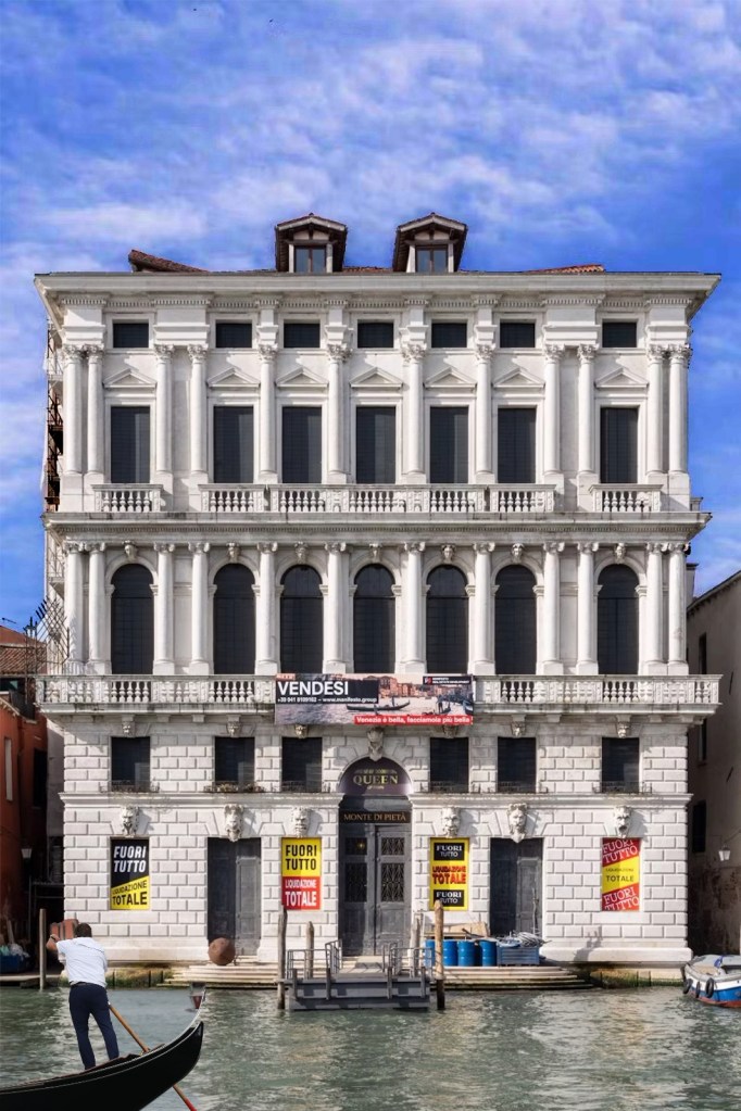 Auf der Fassade zum Canal Grande sind Verkaufsschilder installiert, die das komplette Gebäude zum Verkauf anbieten. Auch diese sind Teil des Kunstwerks.