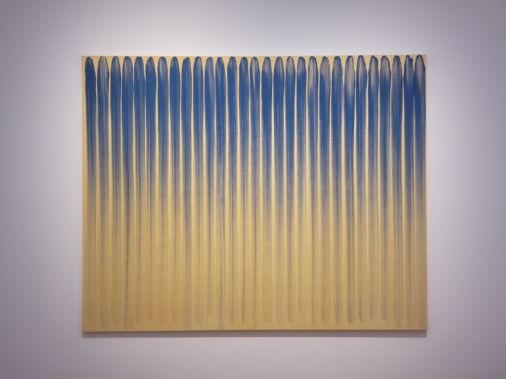 Die Gemälde der Ausstellung wirken etwas spröde und recht leer. Sie entspringen einer Koreanischen Künstlerbewegung der 1970er Jahre (Dansaekhwa) mit Abstraktion in monochromer Malerei. Der Künstler tauchte den Pinsel in Farbe und trug sie rhytmisch auf die Leinwand auf. Er erklärt auch heute, dass die leeren Bereiche seinem Körper entsprechen und deshalb nicht wirklich leer seien. In den neueren Gemälden finden sich eher sporadische Pinselstriche, aber in kräftigem Rot und Blau. Mit etwas Fantasie und Empathie drücken sie Bewegung, Tiefe und Rhythmus aus. Es fällt ein bisschen schwer, sich den großen Leinwänden mit den minimalen Farbanteilen zuzuwenden und ihre Intention zu fühlen. Denkt man aber entsprechend des Grundgedankens der Beziehungen aller Werke im kompletten Raum, ist es etwas leichter.