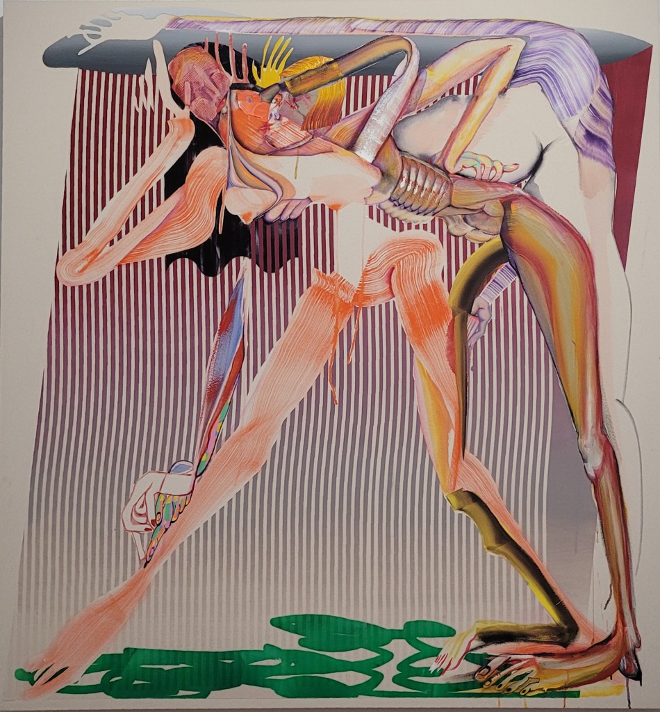 Christina Quarles Gemälde lösen extrem kontrastierende Emotionen aus. Da sind Extase, vertraute Umarmungen, verstörende Berührungen, verzerrte Proportionen oder sogar Fußtritte, aber harmonisch miteinander verknotet, sowohl in pastellen als auch knall-bunten Farben oder collagiertem Materialmix.